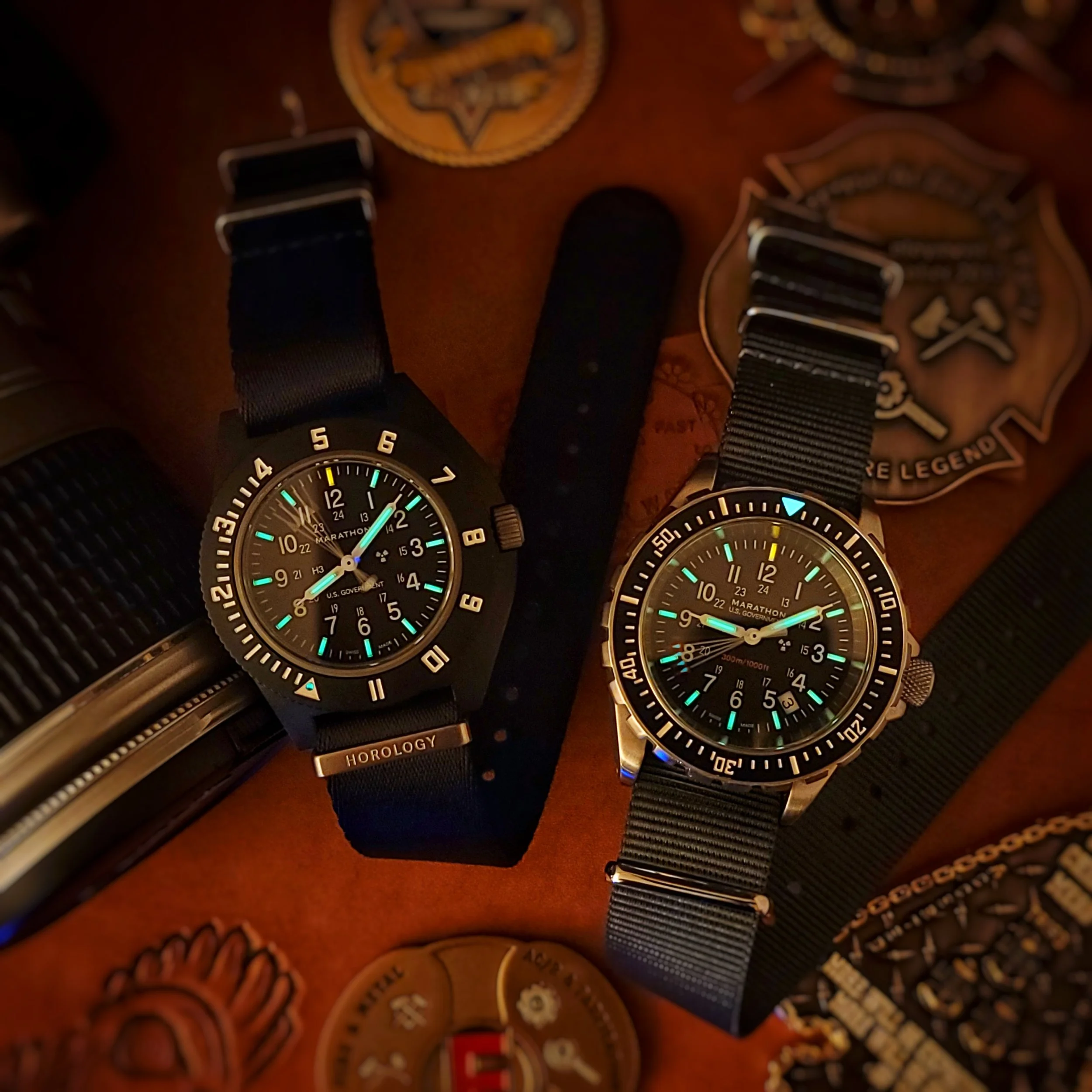 Pictured above are my Marathon Pilot’s Navigator and Tritium Search and Rescue (TSAR) on Standard Time Horology and Mushi NATO straps, respectively.
